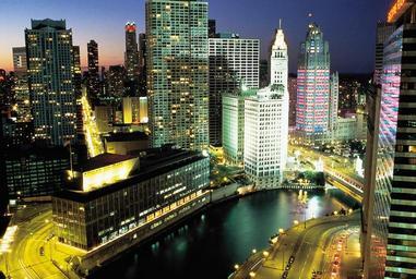Keywords: chicago downtown night lights skyscrapers skyline tower office structure sky river water illuminated bridge street panoramic urban cityscape architecture illinois