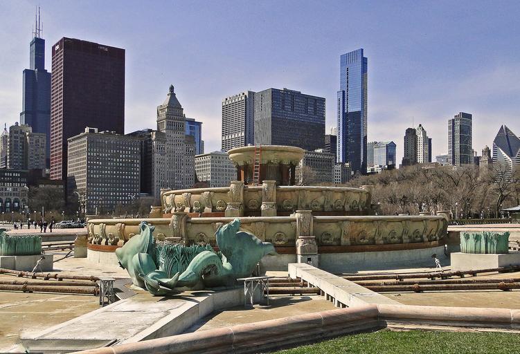 Keywords: chicago fountain repair overview technical water dry sunny skyscrapers high buildings city the centre of clear spring architecture modern decorating ladder