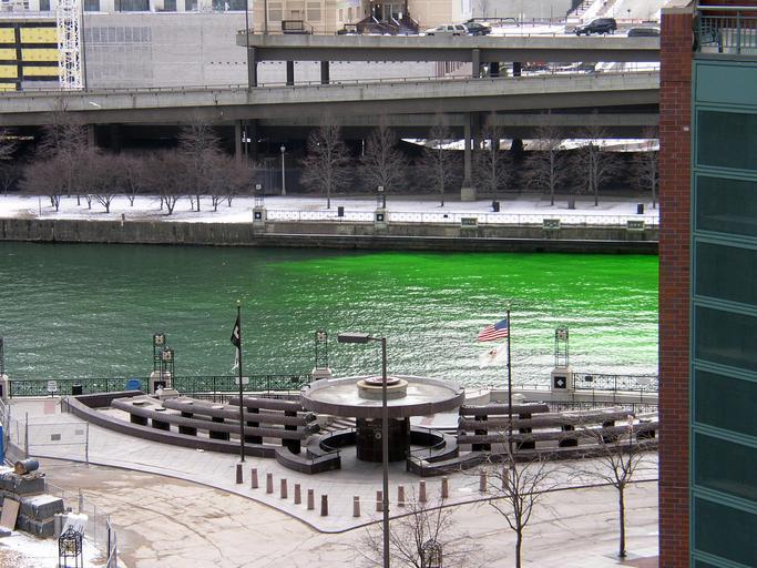 | Keywords: Chicago River, dye travelling upstream.jpg Chicago River In the foreground is Centennial Fountain To the right west the river is being dyed green for the Saint Patrick's Day in Chicago celebration Some of the dye has made its way upstream and into view from the right Across the river the triple-decker Wacker Drive is seen just as the upper and service levels are ending Behind it is a glimpse of the construction at Lakeshore East ;Credits I Knowledge Seeker took this photograph on March 12 2005 It was taken near the intersection of McClurg Court and North Water Street The view faces south Knowledge Seeker Chicago River Water dyed in green for Saint Patrick Saint Patrick's Day in Chicago |
