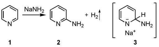 Keywords: Chichibabin reaction.png Scheme of Chichibabin reaction Source Selfmade Date 29 June 2006 Made with ChemDraw 2006-06-29 own assumed Su-no-G