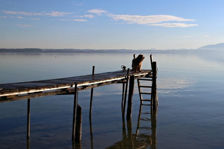 Keywords: chiemsee lake web animal dog bank blue sky water mood rest silent idyll quiet being alone still calm enjoy horizon