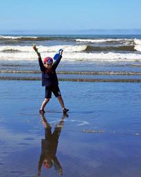 Keywords: child boy joy happiness beach summer reflection happy coastline beach toys vacation ocean coast kid fun
