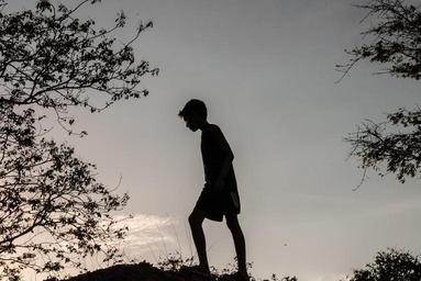 Keywords: boy sunlight coast barefoot natural activity travel climbing rock happiness horizon well being active summer playing freedom evening serene dusk twilight sun dark tourist recreation lifestyle healthy young strength