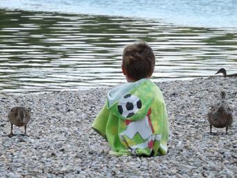 Keywords: child duck lake pebble rear view
