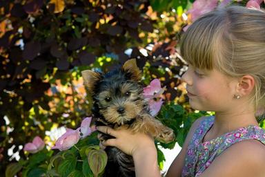 Keywords: child girl blond dog puppy small dog young dog yorkshire terrier yorkshire terrier puppy young small sweet cute out summer keep attention curious childhood
