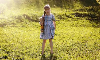 Keywords: child girl blond dress meadow nature sunlight green teddy bear out portrait