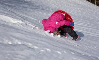 Keywords: child girl bob ride on winter snow downhill down slip somersault in motion in action