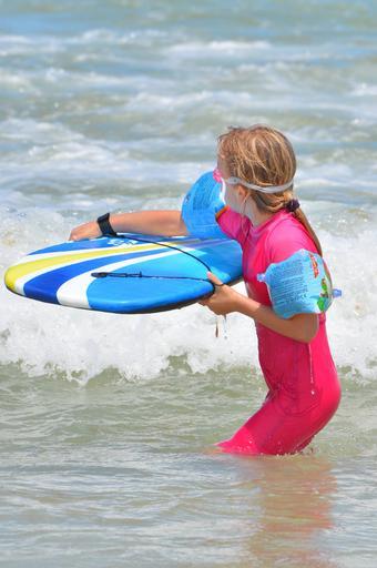 Keywords: child girl surf waves surfboard people sports swimming goggles uv-resistant clothing sea holiday