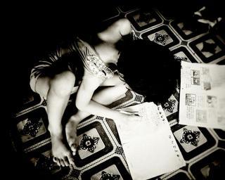 Keywords: child girl writing sitting young childhood black and white