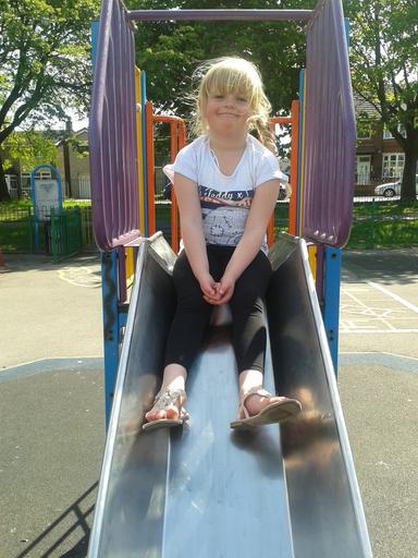 Keywords: child granddaughter slide girl happy smiling family female grandchild outdoors young playground park