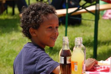 Keywords: child portrait curls outdoor laugh fun soft drinks picnic