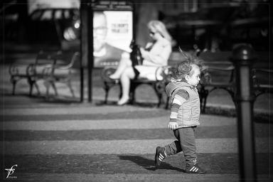 Keywords: child running black and white street life girls woman downtown