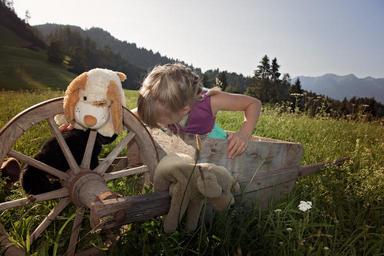 Keywords: childhood play out nature child girl soft toys wheelbarrows meadow mountains leisure carefree