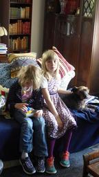 Keywords: children family dog family life animals play living room at home girl bored