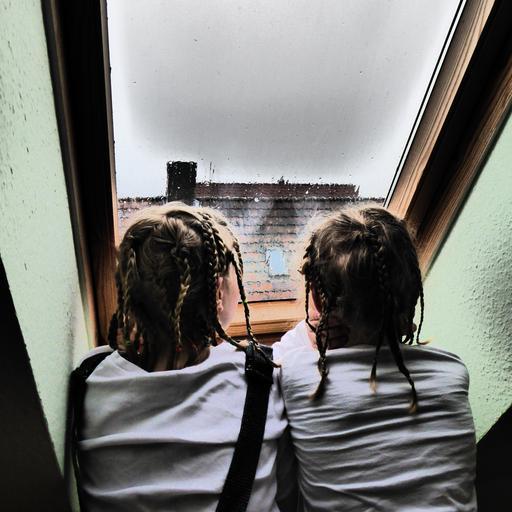 Keywords: children rainy weather roof windows outlook snuggle friendship brothers and sisters move hair braids personal