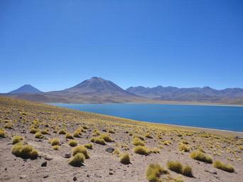 Keywords: chile desert steppe lake partly cloudy blue volcanoes view freedom nature dry atacama atacama desert south america