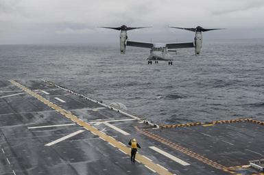 | Keywords: Chilean distinguished visitors land aboard USS America 140823-N-MD297-005.jpg en A tilt-rotor MV-22 Osprey assigned to the Argonauts of Marine Operational Test and Evaluation Squadron VMX 22 transporting distinguished visitors from Chile prepares to land aboard future amphibious assault ship USS America LHA 6 as part of a bilateral engagement America is currently traveling through the U S Southern Command and U S 4th Fleet area of responsibility on her maiden transit America visits the Americas America is the first ship of its class replacing the Tarawa-class of amphibious assault ships As the next generation big-deck amphibious assault ship America is optimized for aviation capable of supporting current and future aircraft such as the Osprey and F-35B Joint Strike Fighter The ship is scheduled to be ceremoniously commissioned Oct 11 in San Francisco U S Navy photo by Mass Communication Specialist 3rd Class Huey D Younger Jr /Released 2014-08-23 Petty Officer 3rd Class Huey Younger https //www dvidshub net/image/1522059 140823-N-MD297-005 2014-08-26 02 00 PACIFIC OCEAN USPACOM AT SEA PD-USGov-Military-Navy MV-22B Osprey USS America LHA-6 Images from DoD uploaded by Fæ |