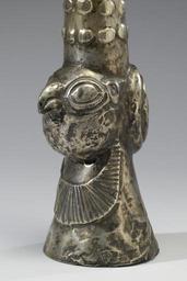 | Keywords: Chimú - Libation Vessel (Qero) - Walters 2009205 - Detail A.jpg The qero was the principal ritual libation vessel among the peoples of ancient Peru Bolivia and northern Chile This distinctive vessel form has ancient origins but became particularly prevalent during the Early Intermediate Period 100-600 CE This dynamic time witnessed socio-political intensification and an increase in the numbers of political elites throughout the Andes with an interconnected multiplication of aristocratic ceremonial events that emphasized hierarchy and authority The ritual consumption of chicha maize beer the mildly alcoholic beverage traditionally served in qeros was integral to these politically charged social events This libation vessel diverges from the typical qero's beaker form The precious metal material also segregates its from the usual ritual drinking vessel made of clay or wood The Chimú qero is unusually tall and embellished with a frontal face AD 1000-1470 Late Intermediate silver alloy cm 42 9 11 1 11 8 accession number 2009 20 5 80160 Ron Messick Fine Arts Santa Fe New Mexico date and mode of acquisition unknown John G Bourne 1990s by purchase Walters Art Museum Gift of John Bourne 2009 place of origin North Coast Walters Art Museum license Metalware beakers Beakers drinking vessels metalware Libation vessels Pre-Columbian art in the Walters Art Museum Chimu metalwork Media contributed by the Walters Art Museum needs category review Ceremonial vessels |