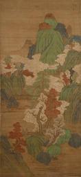 | Keywords: Chinese - Autumn Landscape in Blue-and-Green Style - Walters 353.jpg Two sages cross a bridge In the distance are an elaborate pavilion and a tall waterfall partially shrouded in mist The artist purposefully created an antique-looking painting making use of the ancient blue-and-green style and incorporating the tall mountain peaks of the monumental landscape tradition He also wanted the forms to have a structure-that may look to many of us like a combination of interesting abstract patterns century 17 ink and color on silk mounted on paper L 88 1/8 x W 40 7/8 in 223 8 x 103 8 cm accession number 35 3 14918 Panama-Pacific International Exposition China Pavilion San Francisco 1915 no 5 Henry Walters city Baltimore Walters Art Museum Henry Walters Acquired by Henry Walters 1915 Signature Spurious signature of Zhao Mengfu 1254-1322 ; Inscription lower left; Seal lower left place of origin China Walters Art Museum license 2D Chinese paintings in the Walters Art Museum Media contributed by the Walters Art Museum needs category review Media contributed by the Walters Art Museum needs artist review |