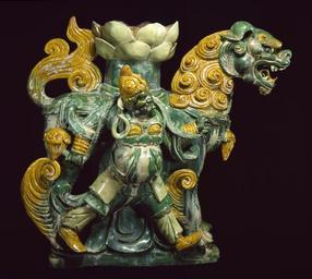 | Keywords: Chinese - Lion Pedestal with Attendant - Walters 49221.jpg Mahayana or Great Vehicle Buddhists believe that the historical Buddha Sakyamuni preached the texts called Mahayana sutras but that these texts were hidden away for several centuries The Bodhisattva Mañjusri riding a lion came to listen to one of these sutras This green and yellow glazed pedestal may have originally held a statue of Mañjusri and have flanked an image of the Buddha century 16 earthenware with lead glaze cm 60 9 accession number 49 221 3824 Yamanaka Co Sale American Art Association New York 1912 no 185 Henry Walters city Baltimore Walters Art Museum Henry Walters Acquired by Henry Walters place of origin China Walters Art Museum license Chinese ceramics in the Walters Art Museum Chinese lions Buddhist statues from China Chinese earthenware Ceramics of the Ming Dynasty |