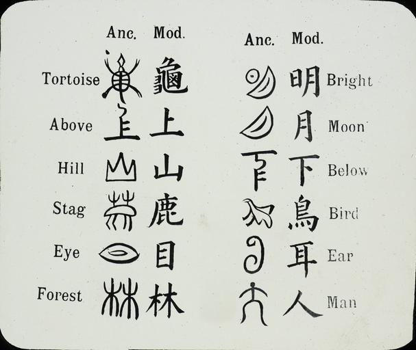 Keywords: Chinese Styles of Writing, China, ca. 1905-1914 (IMP-CSWC47-LS1-49).jpg en <br> Chinese Styles of Writing China ca 1905-1914 Black and white lantern slide illustrating both ancient and modern pre-1949 referred to as traditional Chinese characters The evolution of characters from initial resemblance to their signifiers is displayed This slide comes from a collection held by the Church of Scotland and generated by the medical missionary Charles Somerville who worked for the London Missionary Society in Hankou from 1904 to 1914 Photographer Unknown Subject personal name Calligraphy--China Filename IMP-CSWC47-LS1-49 tif Coverage date 1905/1914 Subject unesco Calligraphy; Asian languages; Handwriting Part of collection International Mission Photography Archive ca 1860-ca 1960 Part of subcollection Photographs from the Centre for the Study of World Christianity University of Edinburgh U K ca 1900-ca 1940s Repository name Centre for the Study of World Christianity Archival file Volume4/IMP-CSWC47-LS1-49 tif Repository address The University of Edinburgh School of Divinity New College Mound Place Edinburgh EH1 2LX United Kingdom Geographic subject country China Format aacr2 lantern slides 8 2 x 8 2cm Geographic subject continent Asia Rights Contact the repository for details Part of series Church of Scotland Slide and Visual Collection; Charles Somerville CSWC47-LS1 Repository email divinity-CSWC ed ac uk Date created 1905/1914 Publisher of the digital version University of Southern California Libraries Format aat lantern slides; photographs Access conditions http //www ed ac uk/schools-departments/divinity/research/centres/world-christianity/collections-resources File CSWC47/LS1/49 Contributor Photo Department Tientsin Hui Wen Academy Tientsin China Subject lcsh Calligraphy; Writing; Chinese language--Cursive writing 1905/1914 date created author http //digitallibrary usc edu/cdm/ref/collection/p15799coll123/id/78428 PD-old-70-1923 Magic lantern images Images from USC Digital Library uploaded by Fæ International Mission Photography Archive ca 1860-ca 1960