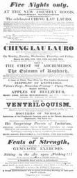 | Keywords: Ching Lau Lauro 10-14 Mar 1834.jpg New Assembly Rooms Queen Street Wolverhampton playbill of Monday-Friday 10-14 March 1834 advertising the magician Ching Lau Lauro and mentioning his performance of the Suspension Illusion for the first time The playbill says that he has performed before Their Majesties at the Pavilion Brighton and received a letter of commendation http //www gutenberg org/files/42723/42723-h/images/illpg_231_lg jpg<br/>This image also appears in Houdini Harry 1908 The Unmasking of Robert-Houdin New York Publishers Printing Co pp 230 “232 1834 Anon PD-old-70-1923 Ching Lau Lauro Playbills of the United Kingdom Aerial suspension illusion |