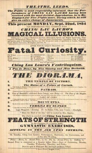| Keywords: Ching Lau Lauro 1834.jpg Theatre Leeds West Yorkshire poster of Monday 22 September 1834 advertising the magician Ching Lau Lauro http //www leodis net/playbills/images/lge/2003618_51241702 jpg 1834-09-22 Anon PD-old-70-1923 Ching Lau Lauro Playbills of the United Kingdom The Theatre Leeds Aerial suspension illusion |