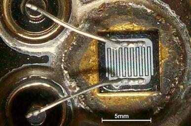 | Keywords: Chipbond bipolartr.jpg en die and wire bonds on an older model of bipolar power transistor de Chip- und Drahtbondverbindungen eines älteren Bipolar-Leistungstransistors der quadratische Chip ist mit einem Goldlot auf eine runde Trägerplatte gelötet die ihrerseits an das Metallgehäuse gelötet ist Diese Verbindung leitet die Wärme ab und bildet den Kollektoranschluss Die beiden aus Aluminiumdraht gefertigten Drahtbondungen sind der Emitter- unten und der Basisanschluss oben die beide auf Beine in Glasdurchführungen links führen own Ulfbastel 2009-06-06 PD Power transistors |