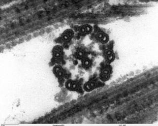 | Keywords: Chlamydomanas reinhardtii Flagella 9 - TEM.jpg Transmission electron microscope image showing an example of green algae Chlorophyta Chlamydomanas reinhardtii is a unicellular flagellate used as a model system in molecular genetics work and flagellar motility studies This image is a thin x-section cut through the isolated axoneme Chlamydomonas flagella have the 9+2 structure characteristic of all eukaryotic cells The axoneme has a central unit containing two single microtubules and nine peripheral doublet microtubules known as the 9+2 Dynein sidearms project from the A tubule of each doublet Also visible in this image are the radial spokes and the inner sheath Smith E F and P A Lefebvre 1996 PF16 Encodes a Protein with Armadillo Repeats and Localizes to a Single Microtubule of the Central Apparatus in Chlamydomonas Flagella J Cell Biology 132 3 359-370 JEOL 100CX TEM http //remf dartmouth edu/imagesindex html http //remf dartmouth edu/images/algaeTEM/source/14 html Elizabeth Smith Louisa Howard Erin Dymek PD Elizabeth Smith Louisa Howard and Erin Dymek Flagella |