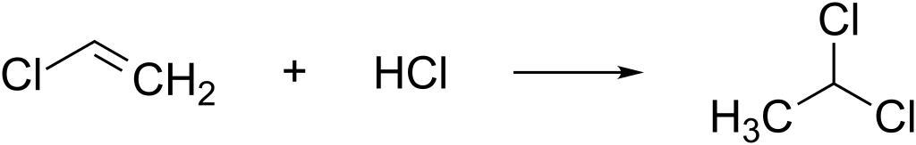 | Keywords: Chloroethene + hydrogen chloride to 1,1-dichloroethane.svg Reaction of chloroethene + hydrogen chloride to 1 1-dichloroethane Own 2014-02-17 Emeldir <span class signature-talk >talk</span> PD-chem Hydrohalogenations Reactions of hydrogen chloride Vinyl chloride |