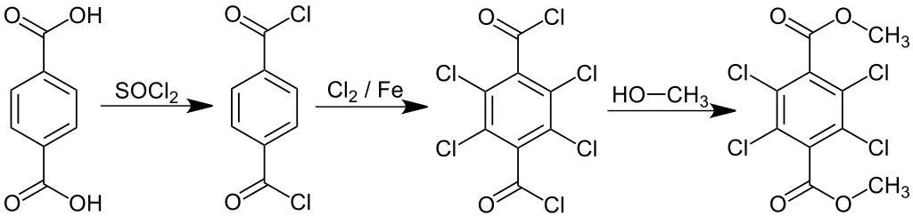 Keywords: Chlorthal Synthesis V.1.svg Chlorthal_Synthesis own 2013-08-28 Jü Cc-zero Herbicide syntheses Tetrachlorobenzenes Methyl esters Terephthalate esters Terephthalic acids Acyl chlorides