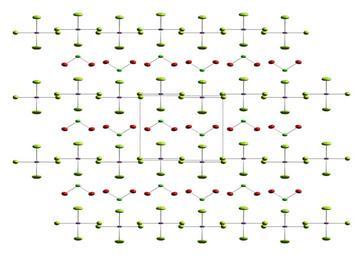 | Keywords: Chloryl-hexafluoroantimonate-xtal-2008-CM-3D-ellipsoids.png Thermal ellipsoid model of the crystal structure of chloryl hexafluoroantimonate ClO<sub>2</sub>SbF<sub>6</sub> Colour code Chlorine Cl green Oxygen O red Antimony Sb purple Fluorine F yellow-green Crystal structure from http //dx doi org/10 1021/ic800929h Inorg Chem 2008 47 8343 8356 Image generated in http //www crystalmaker com/ CrystalMaker 8 2 Own 2010-06-12 Ben Mills Benjah-bmm27 Images by Ben Mills Crystal structures of chloryl compounds |