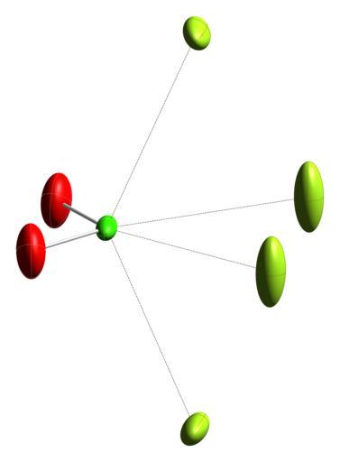 | Keywords: Chloryl-hexafluoroantimonate-xtal-2008-Cl-coordination-CM-3D-ellipsoids.png Thermal ellipsoid model of the coordination environment of chlorine in the crystal structure of chloryl hexafluoroantimonate ClO<sub>2</sub>SbF<sub>6</sub> Colour code Chlorine Cl green Oxygen O red Fluorine F yellow-green Crystal structure from http //dx doi org/10 1021/ic800929h Inorg Chem 2008 47 8343 8356 Image generated in http //www crystalmaker com/ CrystalMaker 8 2 Own 2010-06-12 Ben Mills Benjah-bmm27 Images by Ben Mills Crystal structures of chloryl compounds Chloryl cation Thermal ellipsoids |