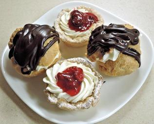 Keywords: chocolate cream puffs cream cheese tarts dessert food sweet whipped cream