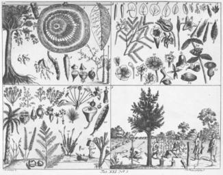 | Keywords: Chodowiecki Basedow Tafel 21 3.jpg Tab XXI Nr 3 Von den Pflanzen a Ein Baum 1 Oben hängend vorgestellt eine Knospe 2 der Durchschnitt eines Stammes 3 ein Blatt 4 à ber der Baumwurzel ein keimendes Samenkorn wie es das Würzelchen zeigt 5 wie es seine Haut abwirft 6 Eine knollige Wurzel 7 schuppige 8 und spindelförmige 9; eine dichte Zwiebel 10 häutige 11 und schuppige 12 Eine Erbsenranke 13 Halmen des Zuckerrohrs 14 “ b Blätter in der Form eines Pfriemens 1 einer Lanzette 2 einer Niere 3 eines Herzens 4 eines Kreises 5; ferner ein anderes ausgeschweift 6 gekerbt 7 sägeförmig 8 gezähnt 9 pfeilförmig 10 lappig 11 schneideförmig 12 und handförmig 13 Drei gedrittete 14 und zweifachgefiederte Blätter 15; ferner Blumen als die trichterförmige Winde 16 die Rose mit ihrer Decke 17 die deckenlose Tulpe 18 die Narzisse mit der scheideförmigen Decke 19; ferner ein Bälglein 20 eine Äre 21 ein schuppiges Kätzchen 22 und ein Zapfen 23 Eine rosenförmige Blume 24 nelkenförmige 25 malvenartige 26 und strahlige 27; andere in Form eines Helms 28 eines Präsentiertellers 29 eines Kreuzes 30 einer Glocke 31 einer Tonne 32 eines Schmetterlings 33 eines Quirls 34 eines Knopfes 35 “ c Blüten in Form eines Regenschirms oder einer Dolle 1 eines Büschels oder einer Rispe 2 eines Straußes 3 und eines Bundes 4 Eine Traube 5 Eine entblätterte Lilie mit ihren sechs Staubfäden 6 und einem Staubwege 7 in ihrer Mitte Eine Orchisblume 10; ein Zwiebelglas 11 Ein Samengehäuse mit vier Fächern 12; eine Eichel 13 Eine unter dem sternförmigen Deckel durchlöcherte Mohnsamenkapsel 14 Zwei Kapseln mit abspringenden Deckeln 15 Drei Arten von Haarkronen an den Samenkörnern 16 Eine durchschnittene Birne 17; eine Nuß 18 mit Fleisch umgeben und eine Beere 19 Eine Erbsenschote 20 Eine Palmenart 21 Gras 22 Farnkraut 23; ein Blatt desselben mit Samen 24 und zwei damit angefüllte und vergrößert vorgestellte Hülsen Moosarten 25 Ein Schwamm oder Pilz 27 Vergrößert vorgestellter Schimmel 30 “ d Gartenarbeit Das Beeteabstechen Das Begießen Das Gäten das Auflockern Das Ablegen Absaugen Pfropfen in die Rinde in die Spalte und in die Kerbe Das Umkehren eines Baumes Beschreibung lt Quelle J B Basedows Elementarwerk mit den Kupfertafeln Chodowieckis u a Kritische Bearbeitung in drei Bänden herausgegeben von Theodor Fritzsch Dritter Band Ernst Wiegand Verlagsbuchhandlung Leipzig 1909 self scanned from book 1774 Christian Heinrich Wolke 1741 - 1825 PD-old-100 Elementarwerk |