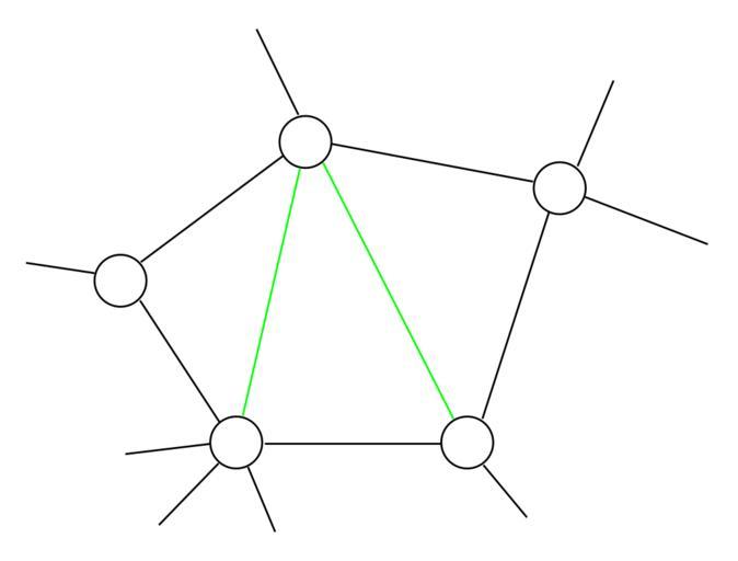 Keywords: Chordal-graph.svg A cycle black with two chords green As for this part the graph is chordal Note that both chords are necessary if one is removed the other green edge with three black edges would form a cycle of four edges with no chord 2006-02-16 own assumed Tizio undirected planar graphs Chordal graph |