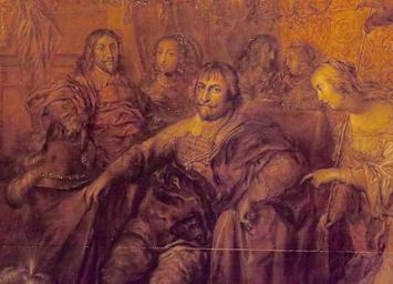 | Keywords: Christian IV som fredsmægler.jpg Christian IV hyldes af Europas lande som fredsmægler i 30-års-krigen Detalje fra allegorisk grisaille fra 1643 signeret Adrian v Venne Rosenborg Slot København own 2016-02 Orf3us PD-old-100 Paintings in Rosenborg Castle Christian IV of Denmark |