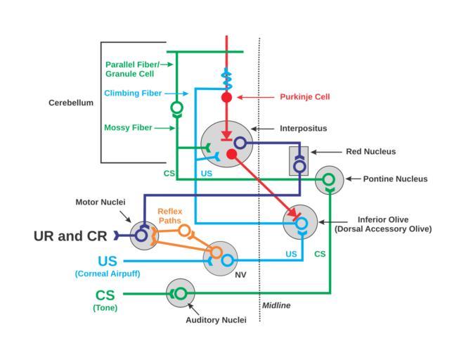 | Keywords: Christian and Thompson Figure 5 SVG.svg en The basic essential circuitry for classical eye-blink conditioning The CS green pathway starts as sensory information in this example an auditory tone entering via the vestibulocochlear nerve and associate with neurons in the auditory nuclei Cells the auditory nuclei project to the contralateral pontine nuclei where they synapse onto third order neurons that project back across midline and enter the cerebellum send a collateral to the interpositus deep cerebellar nuclei and synapse onto granule cells Granule cells in turn continue to the cerebellar cortex forming parallel fibers The US is a puff of air to the eye that enters the via the trigeminal nerve and synapses onto neurons within the trigeminal nucleus NV From the trigeminal complex the first efferent pathway UR reflex paths; orange pathway is a direct projection to facial motoneurons controlling the orbicularis oculi muscle as well as presumably inhibition of the levator palpebrae superioris motoneurons in the caudal central subdivision of the oculomotor nucleus peripheral and direct synapses to Motor nuclei Additionally the US light blue pathway has a second projection with neurons projecting out of the trigeminal nucleus to the contralateral side where they synapse onto third order neurons in the dorsal accessory olive division of the inferior olivary nucleus The third order neurons in the US pathway project back across midline enter the cerebellum sending an excitatory collateral to the interpositus deep cerebellar nuclei then continuing to form climbing fibers on purkinje Pontocerebellar CS and olivocerebellar US collaterals to the interpositus nuclei initiate the CR pathway navy blue pathway Activated cells in the interpositus nucleus project to neurons in the red nucleus which then project on to pre- and motoneurons necessary for blink behavior Purkinje are transiently activated by individual parallel fibers and largely activated by climbing fibers when stimulated they project down to the interpositus nuclei and have an inhibitory effect red pathways Modified from Christian and Thompson 2003; figure 5 2013-01-11 12 29 09 Review Neural Substrates of Eyeblink Conditioning Acquisition and Retention Christian and Thompson PD-USGov Uploaded with UploadWizard Neuroscience Cerebellum Neuroanatomy Learning Behavioral Research Blink Reflex Research Classical Eye-Blink Conditioning Classical conditioning |
