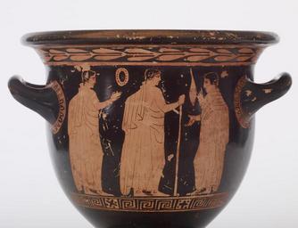 | Keywords: Christie Painter - Red-Figure Bell Krater - Walters 4874 - Detail B.jpg The wine-god Dionysus appears often on vases of this shape called a bell krater which held wine for drinking parties He is usually shown as a bearded and majestic god Here Dionysus holds a thyrsus a pole often twined with ivy and grapevines and topped with a pine cone in one hand and a kantharos a high-handled drinking cup in the other He turns his head to gaze at a maenad who follows while a satyr playing the double flutes leads the procession The maenad carries an oinochoe a wine jug and a lighted torch indicating that the group's journey takes place at night ca 440 BC Classical terracotta cm 29 2 34 30 8 accession number 48 74 29124 Don Marcello Massarenti Collection Rome cat no 170 Henry Walters city Baltimore Walters Art Museum Henry Walters Acquired by Henry Walters with the Massarenti Collection 1902 place of origin Athens Greece Walters Art Museum license Ancient Greek red-figure pottery in the Walters Art Museum Christie Painter Media contributed by the Walters Art Museum needs category review Media contributed by the Walters Art Museum needs artist update Courtship between males who are talking |
