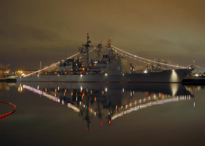 Keywords: christmas lights decoration navy ship pier harbor bright reflection water uss cape st george usa winter seasonal decorative