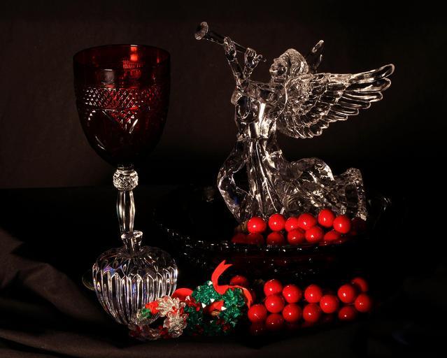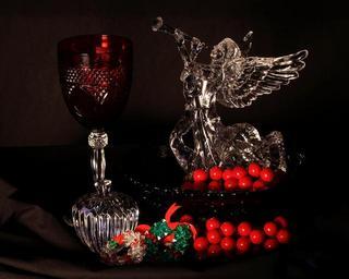 Keywords: christmas still life holiday decoration angel goblet ornaments berries bowl apple crystal glass