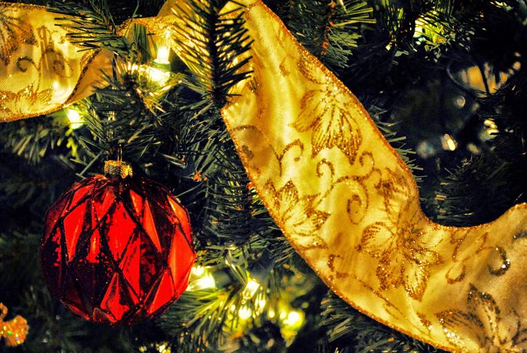Keywords: christmas tree decoration ornament red ribbon christmas tree holiday seasonal ball gold