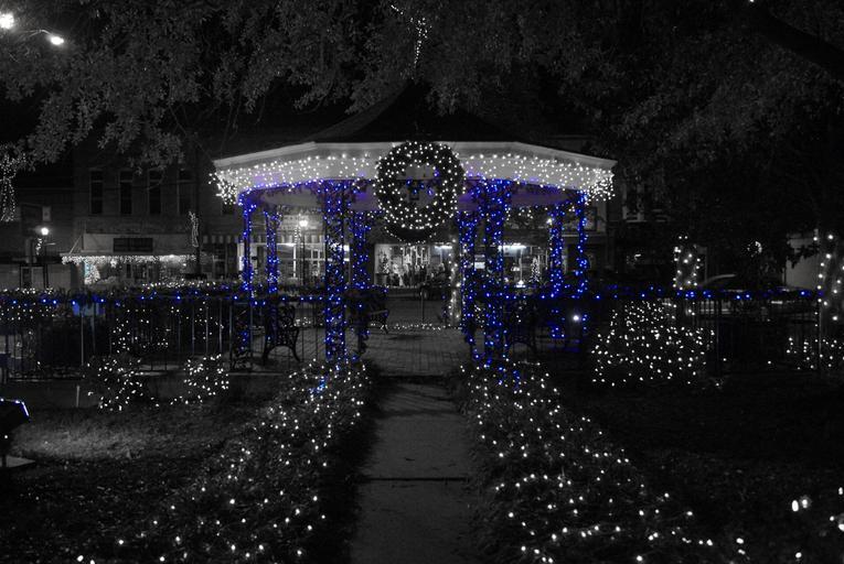 Keywords: christmas x-mas lights green bulbs tree decoration city square town square park bench black and white