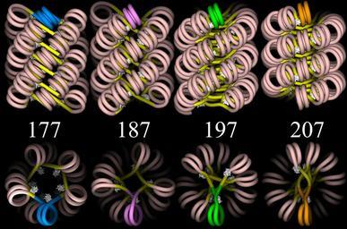 | Keywords: ChromatinFibers.png Four proposed structures of the 30 nm chromatin filament for DNA repeat length per nucleosomes ranging from 177 to 207 bp Linker DNA in yellow and nucleosomal DNA in pink Own 10/06/2007 Julien Mozziconacci Chromosomes Molecular biology |