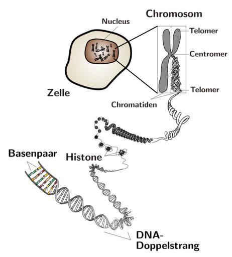| Keywords: Chromosom.svg Modell der Feinstruktur eines Chromosoms <br/> Typisches Lehrbuchbild des Chromosomenaufbaus mit typischen Fehlern Im Zellkern sind Metaphasechromosomen dargestellt; während der Metaphase wird der Kern jedoch aufgelöst in der Interphase liegen die Chromosomen als Territorien vor Das Telomer ist per Definition das Ende des Chromosoms daher kann aus ihm keine Chromatinfiber mehr hervorkommen schon gar keine die nicht die Telomer-DNA-Sequenz enthält Die 10 nm Fiber DNA mit Nucleosomen ist spiralförmig zur nächsthöheren Faltungsstruktur aufgewickelt 30 nm Fiber welche wiederum spiralförmig aufgewickelt ist Diese spiralförmigen Aufwicklungen sind Spekulation http //www genome gov/Pages/Hyperion//DIR/VIP/Glossary/Illustration/chromosome shtml NIH User Phrood <gallery> Chromosom und DNA png Chromosom Chromatide Feinstruktur png Chromosom svg Chromosom pl svg Chromosome fr svg </gallery> The source image may be used without special permission I User Phrood changed the text and added some colors This file contains vectorized glyphs from the Computer Modern fonts by the American Mathematical Society These fonts are copyrighted however they may be used freely provided that any changes from the original files are published under a different name http //www ams org/tex/type1-fonts html PD-USGov-NIH Chromosomes SVG diagrams in German Biology diagrams |