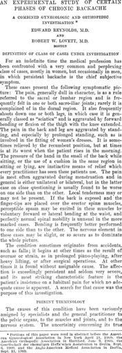 | Keywords: ChronicBackache1033.png CHRONIC BACKACHE--REYNOLDS AND LOVETT Journal of the American Medical Association Chicago Ill 1910 REYNOLDS Edwards AND LOVETT Robert W PD Image ChronicBackache1043 png <gallery> Image ChronicBackache1033 png Image ChronicBackache1034 png Image ChronicBackache1035 png Image ChronicBackache1036 png Image ChronicBackache1037 png Image ChronicBackache1038 png Image ChronicBackache1039 png Image ChronicBackache1040 png Image ChronicBackache1041 png Image ChronicBackache1042 png Image ChronicBackache1043 png </gallery> VOLUME LIV NUMBER 13 ETHETR AND IMMUNITY--GRAHAM 1043 PD-old AN EXPERIMANTAL STUDY OF CERTAIN PHASES OF CHRONIC BACKACHE A COMBISED GYXECOLOGIC AND ORTHOPEDIC INVESTIGATION EDWARD REYNOLDS M D AND ROBERT W LOVETT M D BOSTON DEFINITION OF CLASS OF CASES UNDER INVESTIGATION For an indefinite time the medical profession has been confronted with a very common and perplexing dnss of Cllses mostly in women but occasionally in men in which persistent backache is the chief subjective symptom These cases present the following symptomatic picture The pain generally dull in character is as a rule referred to the sacral or lumbar region and is frc~ quently felt iu one or both sacro-iliac joints; rarely it is complained of in the dorsal region It also freqnently shoots clown one or both legs in which case it is generally classed as sciatica and is aggravated by forward bending or flexion of the thigh with the knee extended The pain in the back and leg are aggra ated by standing and especially by prolonged standing such as is involved in the fitting of women's dresses It is some~ times reli eved by the recumbent position but at times is at its worst rhen the patient rises in the morning The pressure of the hand in the small of the back while sitting or the use of a cushion in the same region in sitting or lying are instinctive means of relief which every practitioner has seen these patients use The pain is mo~t often aggravated during men ;;truation and in general is either unilateral or bilateral but in the latter case on close questioning is usually found to be worse on one side than on the other Local tenderness mav or may not he pre ent If the back is exposed and' the finger-tips are placed over the erector spinoo mUEc1es perceptible spasm may be excited in these muscles by voluntary forward or lateral bending at the wai t~ and perfectly normal spinal mobility is unusual in the more marked ca5es Bending is frequently better performed to one side than tn the other The nervons element in thCi3C cases _ may be slight or so severe as to dominate the whole picture The condition sometimes originates from accidents such as falls; it begins at other times as the remit of oyeruse or strain~ as in prolonged piano-playing after heavy lifting or nfter surgical operations At other times it is founel vithout assignable cause The affection i;; exceedingly persi~tent and seldom very Ee erc and 1t3 most triking characteristic feature j~ the patient's insistence on ~ habitual pain for vlJieh nt adequate cam c is apparent A search for that cau~e was the purpose of this iuyestigfltion PHEST~XT TETDIJSOLOGY The cau~es or this condition have heen variously assigned by speeiali 3ts and the general practitioner to the pelvie organs to the mU3cle ~ and joints and tt the nervollS sy '3h m The uncertainty concerning it ;; true Permanent corset treatment Reynolds and Lovett - Chronic Backache |