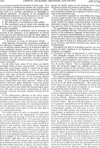 | Keywords: ChronicBackache1042.png CHRONIC BACKACHE--REYNOLDS AND LOVETT Journal of the American Medical Association Chicago Ill 1910 REYNOLDS Edwards AND LOVETT Robert W PD Image ChronicBackache1041 png PD-old conclusions governing the treatment of these cases It is evirlent that a determination whether the original cause of the hack ache is primarily intra-abdominal or originÂally static is a necessary preliminary to intelligent or effective treatment In practice in the comparatively limited field selected by us for discussion here the eases wonld seem to fall schematically into thrce c1a es The gyneCQlogic of intrapelvic origin The orthopedic of mechanical or static origin The borderland cases 'in which both elements are pr ent or in which the differentiation hetween the two is at first impossible The recognition of a borderland class is necessary on account of the frequency oI it appearance in clinical work but thc line between this and the other c1 sses is so indefinite that it can be described only by implication under the other headings <center>1 Treatment of Cases of 1 ntrapeh'ic Origin</center> Static backache is frequently a promineut symptom oI the intrapelvic ncoplasms It is then due to an alteraÂtion of attitude caused either by an instinctive effort to lessen pathologic pressure ithin the pelvis or by dis4 turhance of balance fTom the actual weight of the laTger growth In the'e cases no improvcment in the static condition can be expected until after the removal of the nE'oplaRm and here an immediate opel'atiye removal should be promptly followed by propcr orthopedic tTeatÂment if necessaTY On the other hand many of the pto es are merely secondary results of static abncnnalitie In these cuscs especially gynecologi ts should be careful not to adopt treatment without first making a stuely of the static causes which so often haye produced or are perpetuating them since some previously nmnanageable retroverted uteri prolapse-d oVHl'ies etc call be promptly relieved by minor intrapelvic treatment after the static fault which caused them have been correct 1 Ptoses of the kidneys and other upper abdominal v; cera are equally important and shonld be considered Under these conÂditions also those cases which still demand major measÂurcs will more surely become symptomatic as well as anatomic snccesses nnd many anatomic failures will be aided ¢ In the inflammatory ffcdion of the peh-ic organ the instincti'-e efforts of the patient to protect the tenelcr ~trndnl'es from the pres~t1re~ and jars which are alw lYS incirlent to locomotion in the crect posture lead usually' to so persistent a maintenance of a constrained attitude that the prominence or tatic bac-k~chc in these cases is easily understood in thc light of 'hat has becn said in onr experimental section Thc relative value of static 01' intrapelvic treatmcnt 8 an initial step in the management of these caBCS depend largely on the sta e of acutene ' at the time at which treatment is undcrtakcn Jt is enerally conceded that during toc preseuce of an acutc symptomatology thc infhtOlmatory affections of the peh-ie organs should have dcplcti c nd soothing rathcr than radical treatment In the more cute cascs the musclcs of the back arc almost invariably in a ~tate of irritation anLl Sp 1Sffi and no part of the initial palliatory trcatment is more imporÂtant or more promptly grateful to the patient than rcst in bed support to thc il'l'itated muscles hot packs the loca electric light bath ctc for thcir relief On the othcr hanel even ill thc chronic cases too earlv attempts at mechanical correction of the faulty posture· are apt to do harm rather than good so long as the pel ic tenderÂnr ~ cs arc unrclicrcu since if successful they agnin expose the tender organs to the prc sures from which the faulty attitnde has partially relicved them The complication of ptoses with inflammatory condi_ tions demands evidently thc weighing of rel lti\'c indica tions in the individual case It is manifestlv impossible to cover within the lenath of snch a paper as this evcn in outline the wholc fi~ld of gynecologic practice in its relation to static backache even without the equally important lesions of general abdominal surgery but we hope that what has bcen here said may serve to illustrate the principles involvcd The gynecologist may of conrse Teadily examine the backs of bis paticnts and may with practice acqnire Some facility in the differential diagnosis of back-strains into thosc of primarily intra-abdominal OT primarily static origin bnt he should never forget that in the static ca;e the abnormality which is the original cause of the sympÂtom may often be found in a distant part of the skeleton e g the feet and that its detection may reqnire special knowledge Throughout the field of gynecologic practicc thc csti mation of static conditions is of importance whcn er backache is a symptom <center>2 Treatment of Cases of Mechanical or Static Origin</center> The orthopedic surgeon will be wise to rcfer to the gynecologist for a preliminary examination uud opinion by which to gnide treatment thosc ca cs in hieh the hi~tory 01' the replies to the usuill questions are suggc54 tive of utcrine disease This is especially important when the symptoms snggest the possib le presencc of inflammatory di~ea3e of the intrapclric organs ¢ incc in these cases as has been ~aicl aboyC' altcHltioo of attitmlc sneh as would hc indicatcd by thc bark· hain aionc mav be distinctly harmful The accepted orthopedic trcatment of back-strain a ' it exists to-day has been already spoken of in the beginning of the paper It is a matter of common information that it is on the whole unsatisfactory Thc treatment which from onr point of iew should be in theory the most satisfactory and which in practice in our hands has proved the most successfnl is as follOws A defect of balance cxists which in the cnd must be curcd by remedying that defect of balance a matter only to be broug