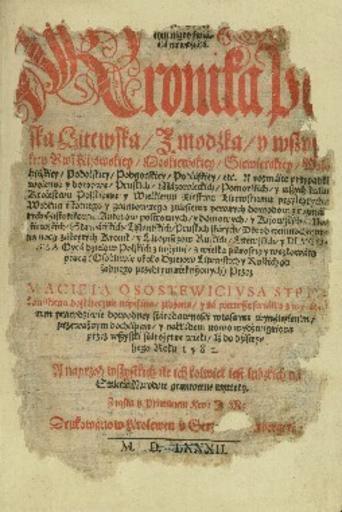 | Keywords: Chronicle Stryjkowski.jpg en Title page of Chronicle by M Stryjkowski ru Титульный лист Х оники Ст ыйковского be Тытульны лiст К онiкi Ст ыйкоускага http //www mb vu lt/unesco/knygos/knygos/istorija/strik/anglu/eastrik1 htm M Stryjkowski 1582 PD-old-100 Chronicles Maciej Stryjkowski |