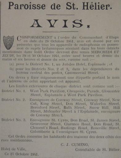 Keywords: Chroniques de Jersey Octobre 1941 radios.jpg PD-old Official notice in Les Chroniques de Jersey October 1941 about the confiscation of radios from residents of Saint Helier Jersey in reprisal for a campaign of resistance against occupying forces own photo of old newspaper 1941-10 Man vyi Own work all rights released Public domain 1941 documents 1941 in radio German military orders in Jersey 1941 in Jersey Jersey resistance during World War II Newspaper advertisments in Saint Helier Jersey Newspapers of Jersey Radio of Jersey |