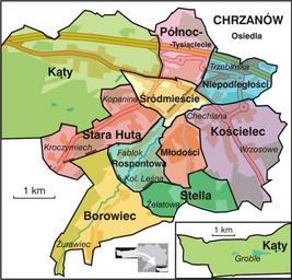Keywords: Chrzanow quarters.svg Map of administrative quarters in the town of Chrzanow Poland Own 2007-07-29 Obbie Maps of Chrzanów
